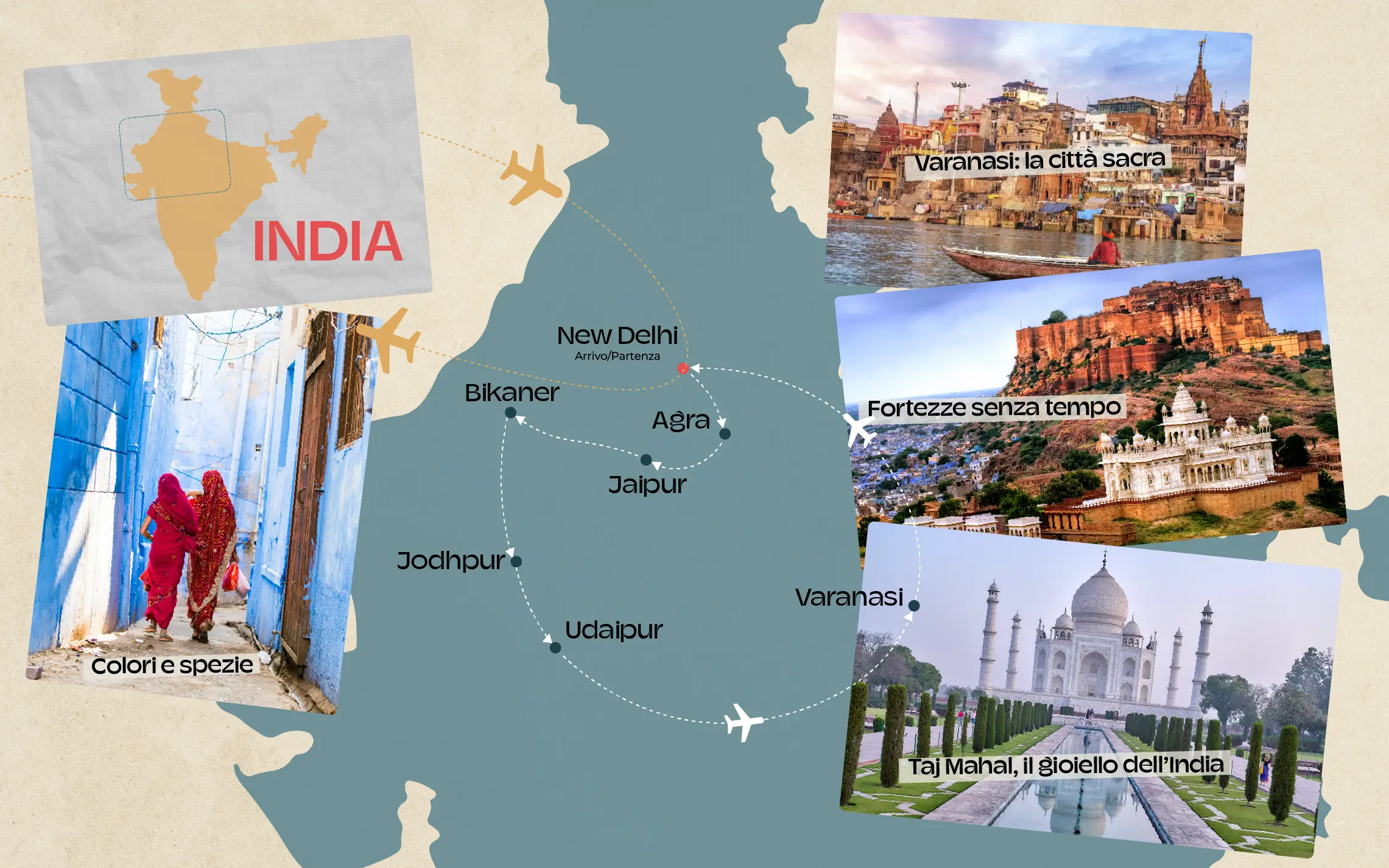 Attraverseremo il Thar, il grande deserto, sulle orme delle carovane, lasciandoci cullare dal ritmo del cammello e dal silenzio delle dune. Ci perderemo tra i colori dei mercati, tra sete cangianti, profumi di chai e spezie, statue scolpite e sguardi profondi.
