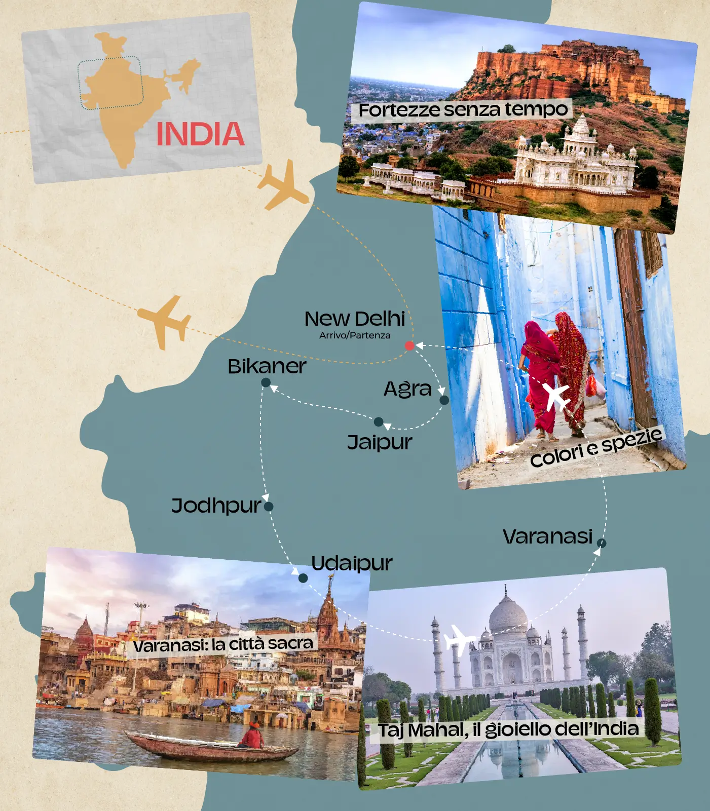 È necessario il passaporto con validità residua di almeno 6 mesi dalla data di ingresso in India e il visto turistico elettronico (e-Visa), facilmente ottenibile online. Ti forniremo tutte le istruzioni.